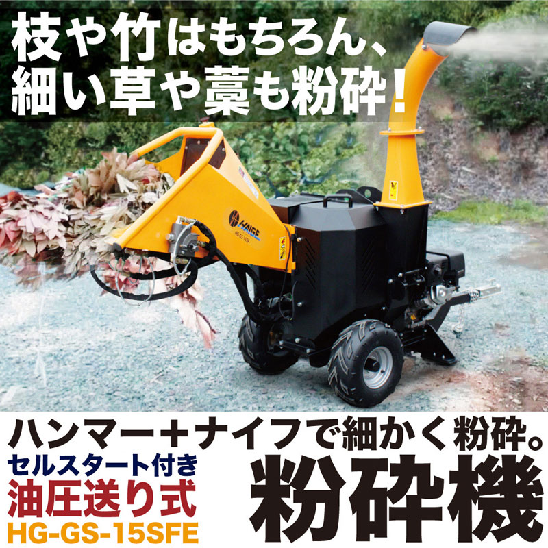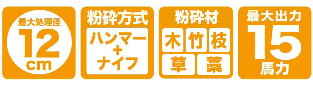 商品スペック エンジン形式 4ストロークOHVエンジン エンジン馬力 15HP 総排気量 420c㎥ 粉砕可能な枝径 最大120mm ※材の硬さ・曲がり具合・繊維の密度などで変わります。