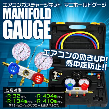 【送料無料】【最大2000円クーポン配布中】エアコンガスチャージ マニホールドゲージ R134a R410a R404a R32 対応 冷媒 エアコン ガスチャージ ゲージマニホールド クーラー ルーム 車 カーエアコン 缶切&クイックカプラー付 ガス補充 空調 補充 工具
